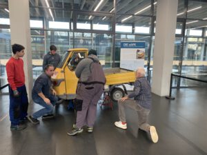 Noch ist das Projekt nicht ganz abgeschlossen: Bremsen und Räder der APE benötigen noch etwas Aufmerksamkeit. Hier unterstützen Michael Windt und seine Schüler von der Carl-Benz-Schule Karlsruhe tatkräftig und bringen ihr Know-how aus dem Bereich Fahrzeugtechnik ein. Auch das äußere Erscheinungsbild der APE soll in einem weiteren Schritt aufgewertet werden. Über die Fortschritte dieses Projekts werden wir selbstverständlich weiterhin berichten.